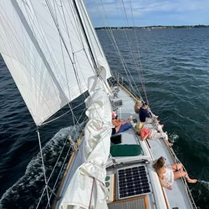 Our two sailboats are icons of the Newport Sailing fleet and of Narragansett Bay. Lyra is our 44-foot Reliance sailboat and Wren is our 35-foot Allied Seabreeze. With a capacity of up to 6 guests each, both boats sail on daily charters from Newport RI, beginning mid-April through the end of October. We offer private 90-minute, two-hour, three-hour, half and full-day sailing charters. From tours and advanced sailing instruction to proposals or a romantic evening on the the water, experience for yourself why Newport is the sailing capital of the Americas. Splash your feet, sail a boat or relax with your group over a tasty beverage.